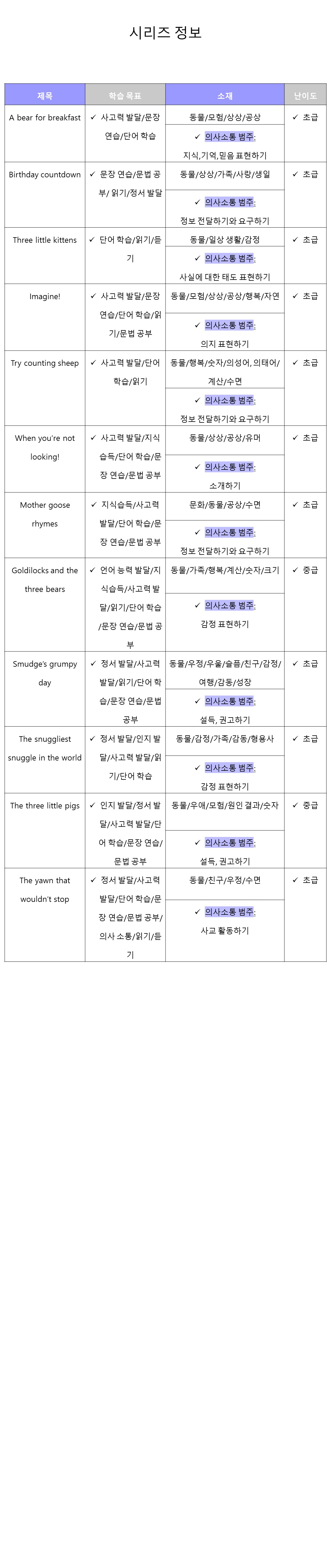 익숙한 스토리의 전래 동화들과 마더구스(Mother Goose), 너서리 라임 등과 새로운 창작동화들로 구성된 총 12권 시리즈로 Family / Parents, Action & Adventure / General, Holidays & Celebrations / Birthdays, Humorous Stories, Activity Books/ Mice, Hamsters, Guinea Pigs, Etc., Animals / Baby Animals, concepts / Counting & NumbersImagination & Play 등의 주제가 다양하게 섞여 있습니다. 각각의 책들에는 아이들의 인성교육이나 식사 습관 바로잡기 등의 교육적인 요소가 동화 속에 녹아들어 있어 재미있게 책을 읽으면서 영어학습과 생활교육의 효과도 함께 즐길 수 있습니다.