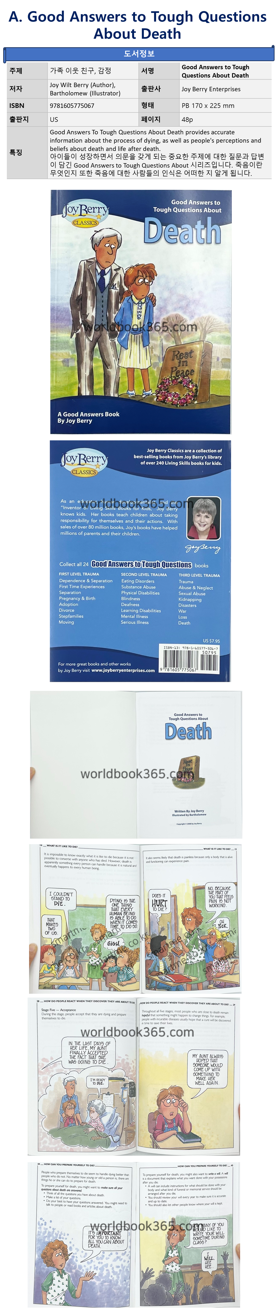 | Good Answers to Tough Questions (GATQ) 인성동화 학급문고 | 아이들이 성장하면서 의문을 갖게 되는 중요한 주제에 대한 질문과 답변이 담긴 Good Answers to Tough Questions About 시리즈입니다. 죽음이란 무엇인지 또한 죽음에 대한 사람들의 인식은 어떠한 지 알게 됩니다 | Good Answers to Tough Questions About Death | Joy Berry | 9781605775067 |