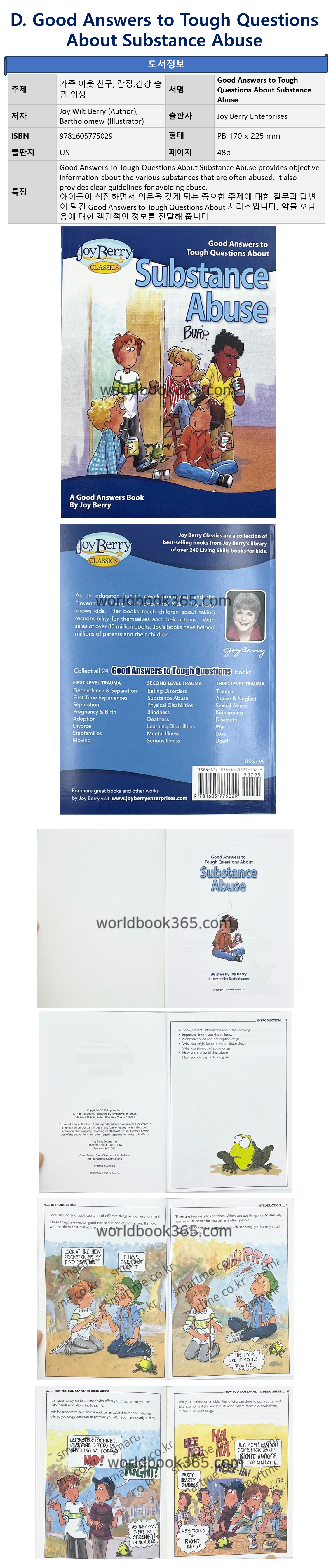 | Good Answers to Tough Questions (GATQ) 인성동화 학급문고 | 아이들이 성장하면서 의문을 갖게 되는 중요한 주제에 대한 질문과 답변이 담긴 Good Answers to Tough Questions About 시리즈입니다. 약물 오남용에 대한 객관적인 정보를 전달해 줍니다. | Good Answers to Tough Questions About Substance Abuse | Joy Berry | 9781605775029 |
